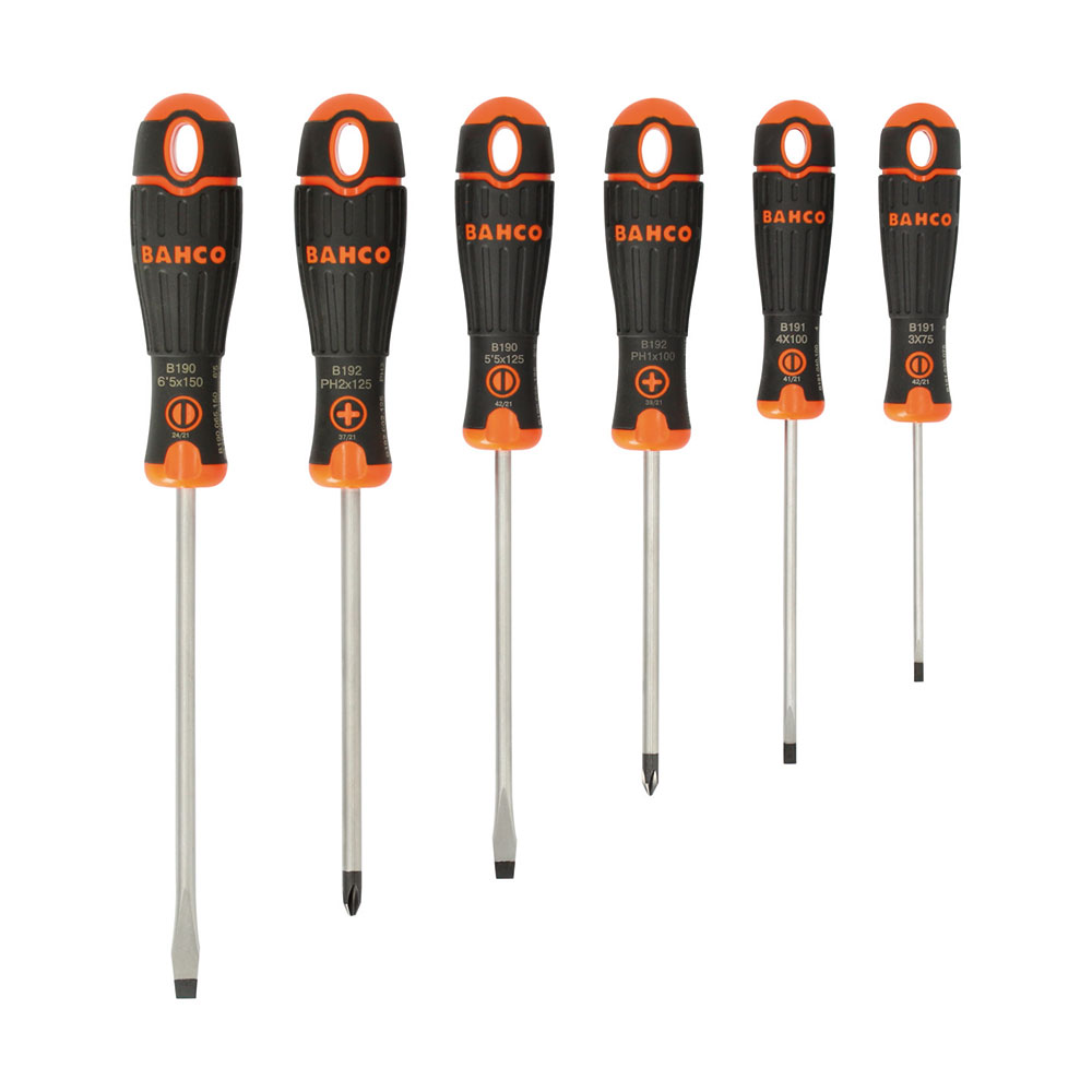 JUEGO DE 6 DESTORNILLADORES BAHCOFIT CON AGARRE DE GOMA. CONTENIDO: PLANOS 3 x 75; 4 x 100; 5.5 x 125; 6.5 x 125 Y PHILLIPS PH1 x 100; PH2 x 125