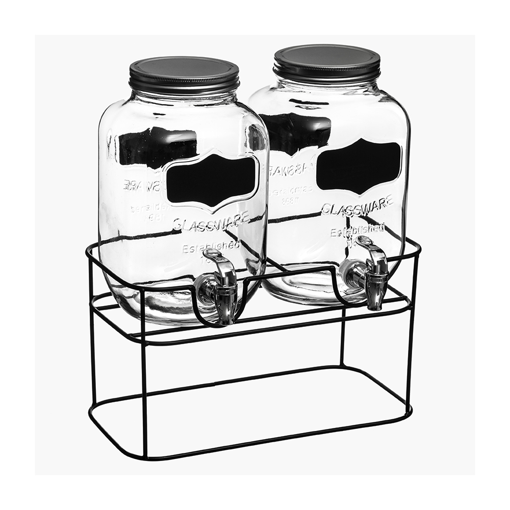 DISPENSADOR DE BEBIDAS DOBLE. MEDIDAS DISPENSADOR: 25,5x23x14cm. MEDIDAS SOPORTE: 31,8×17,6x17cm CAPACIDAD 4L POR DISPENSADOR.